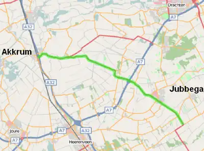 De weg is uitgevoerd als tweestrooks-gebiedsontsluitingsweg, waar een maximumsnelheid van 80 km/h van kracht is. In de gemeente Heerenveen heet de weg Gorredijksterweg (zuidelijk deel) en Easterboarn, Braksdyk, Sudkant, Wjitteringswei en Boarnsterdyk (noordelijk deel), in de gemeente OpsterlandNijewei, Hans de Jongwei, Koaibosk, Bregeleane, De Rakken en Warrewei.