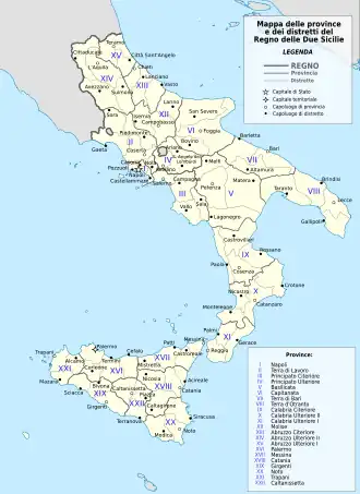 - ↑ (it) De Sanctis, Gabriello (1840). Dizionario statistico de' paesi del regno delle Due Sicilie. Tolentino & Mortello, Napels, "Designazione di provincie e distretti", blz 30.