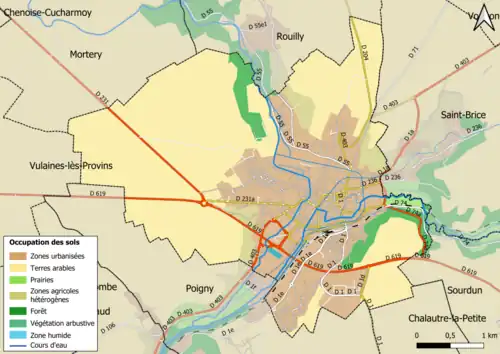 De onderstaande kaart toont de ligging van Provins met de belangrijkste infrastructuur en aangrenzende gemeenten.