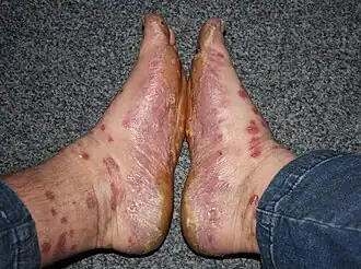 - Bij psoriasis-erytrodermie is het gehele lichaamsoppervlak aangedaan. Het betreft een ernstige vorm van psoriasis, die in zo'n 2 procent van de gevallen optreedt. Roodheid van de huid is het opvallendste kenmerk. Alle andere symptomen van psoriasis zijn aanwezig, maar de schilfering en plaquevorming zijn meestal minder prominent. Hypothermie, hypoalbuminemie en hartfalen kunnen optreden. De kans op levensbedreigende situaties is aanwezig. Het kan optreden na een niet verdragen behandeling van de huid met ditranol of UVB, en kan dan gezien worden als een gegeneraliseerde köbnerreactie. Het kan ook veroorzaakt worden door bepaalde andere medicijnen, atopische dermatitis (eczeem), en cutaan T-cellymfoom.[7][8]