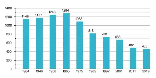 | Jaar | 1934 | 1946 | 1956 | 1965 | 1975 | 1985 | 1992 | 2001 | 2011 | 2018 | ||||