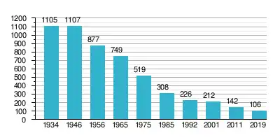 | Jaar | 1934 | 1946 | 1956 | 1965 | 1975 | 1985 | 1992 | 2001 | 2011 | 2018 | ||||