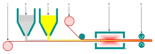 In het vlakbedpultrusieproces worden de vezels (2) en het hars (3) op een foliedrager (1) van celglas gestort. Deze foliedrager wordt door de aandrijfrollen (6) door het proces getrokken. Op deze manier worden de vezels en het hars, op de gewenste dikte, opgebracht. Hierna wordt er een foliedrager (4) als toplaag aangebracht. Het geheel hardt vervolgens uit in de oven (5). De vlakke platen worden op grote rollen opgerold. Door de aandrijfrollen te profileren worden (geprofileerde) platen gemaakt.