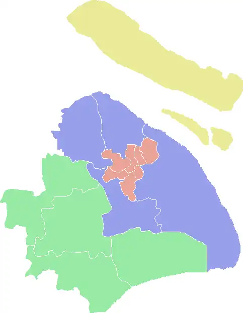 De indeling van Shanghai in 17 districten en 1 county: rood is Puxi, blauw zijn de districten van de voorsteden, groen zijn de districten van de verder afgelegen satellietsteden, en geel zijn de eilanden in de monding van de Jangtsekiang die samen de county Chongming vormen.