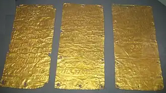 In 1964 brachten de opgravingen van Massimo Pallottino drie dunne goudbladeren naar boven, waarvan twee in het Etruskisch en een in het Fenicisch beschreven, met vergelijkbare inhoud. De goudbladeren bevinden zich in de Villa Giulia in Rome.