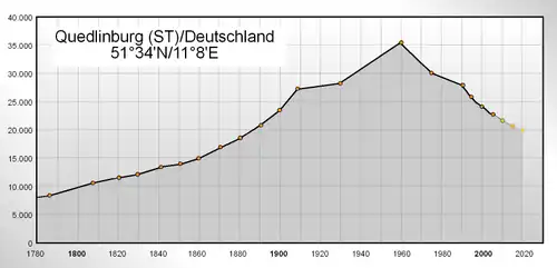 Vanaf het einde van de middeleeuwen tot in de negentiende eeuw is de bevolkingsomvang van Quedlinburg ongeveer gelijk gebleven met maximaal 10.000 inwoners. Met de industrialisatie kwam daar verandering in en groeide de bevolking snel. Het maximumaantal inwoners werd met 35.426 in 1950 bereikt. Sindsdien krimpt de bevolking echter weer geleidelijk. Zeker sinds de hereniging van 1990 gaat het snel. Veel inwoners trekken weg vanwege de aanhoudende werkloosheid en bovendien daalt ook het geboortecijfer.