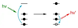 Het uitgezonden foton heeft een langere golflengte. Het verschil in golflengte vertegenwoordigt een verschil in energie dat in de regel als warmte verloren gaat. De uitgezonden golflengte is karakteristiek voor het element van het atoom dat verantwoordelijk is voor het proces. Dit betekent dat het effect als methode gebruikt kan worden voor het bepalen van de elementaire samenstelling van het beschoten materiaal. Deze analytische methode heet röntgenfluorescentiespectrometrie.
