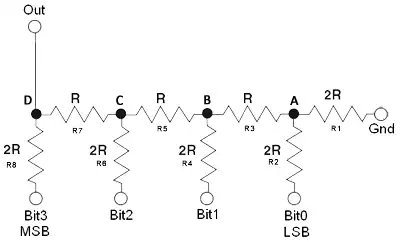 Het netwerk bestaat naast de weerstanden uit digitale inputs (bit 3 tot en met bit 0). Deze binaire inputs worden aangestuurd door het digitale computersysteem met behulp van spanning. Bij een binaire '1' wordt op de inputs de referentiespanning aangelegd, bij een binaire '0' bedraagt deze 0 volt, wat wil zeggen dat deze aan de aarde gelegd worden. Hierdoor ontstaat aan de uitgang (out) van deze schakeling via de serieparallelschakeling van de weerstanden een uitgangsspanning die, afhankelijk van de digitale inputs, varieert van 0 volt in stappen tot bijna de referentiespanning.