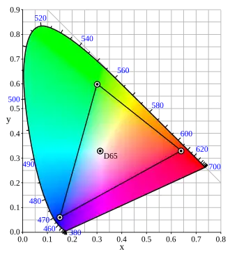 Op de afbeelding rechts is het CIE-standaardchromaticiteitsdiagram te zien. Dit geeft een benadering van het gehele kleurbereik van het menselijk oog aan. RGB beslaat slechts een deel van dit diagram. De hoeken van de driehoek in het diagram geven "zuiver" rood, groen en blauw volgens RGB weer. Alle mengsels van deze kleuren vallen binnen deze driehoek, kleuren buiten de driehoek kunnen niet worden weergegeven. Als benadering wordt een kleur op de rand van de driehoek gekozen die ten minste dezelfde tint heeft. Deze benadering heeft altijd een lagere verzadiging dan het origineel. Het resultaat is dus enigszins flets.