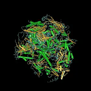 - DNA-directed RNA polymerase II subeenheid RPB1 – een enzym dat bij mensen het gen POLR2A afleest en bij gist RPO21. RPB1 is de grootste subeenheid van RNA-polymerase II. Het bestaat uit een carboxylterminaal eiwitmotief (CTD) met tot 52 heptapeptide repeats (Tyr-Ser-Pro-Thr-Ser-Pro-Ser), die onmisbaar zijn voor de polymerasewerking.[20] Het CTD is ontdekt in het laboratorium van C.J. Ingles van de University of Toronto en door J.L. Corden van de Johns Hopkins University. In combinatie met verscheidene andere polymerase subeenheden vormt het RPB1 het DNA-bindingseiwitmotief, de groef waarin de DNA-template wordt getranscribeerd in RNA.[21] Het heeft een sterke wisselwerking met RPB8.[22]