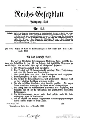 - ↑ Aufruf des Rates der Volksbeauftragten an das deutsche Volk vom 12. November 1918. In: documentarchiv.de, laatst gezien op 12 november 2018.