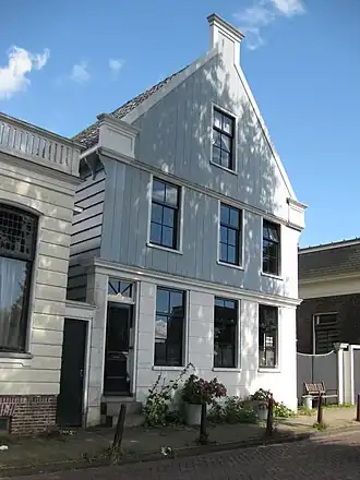 Het raadhuis was een 18e-eeuws houten dijkhuis met Zaanse gevel en achtergevel, begane grond, verdieping en zolder en voorzien van een puntvormig voorschot en werd oorspronkelijk gebouwd als woonhuis. Na de ingebruikname als raadhuis kwam het kantoor aan de voorzijde en in de woonkamer aan de achterzijde vonden de raadsvergaderingen plaats. Links naast het dijkhuis stond een gevel met een kooi waar huwelijken werden gesloten. Ook bood het raadhuis dienst en woonruimte voor de veldwachter die over een aantal cellen beschikte. Na het vertrek naar het nieuwe raadhuis werd het weer een woonhuis en is een rijksmonument.[1]