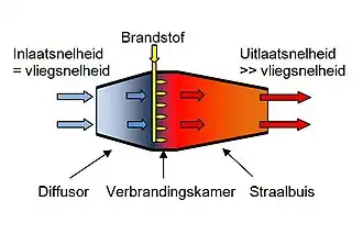 Een ramjet bestaat uit een diffusor, een verbrandingskamer en een straalbuis. De ramjet wordt pas gestart als het vliegtuig of het projectiel, waar hij aan bevestigd is, een hoge snelheid heeft. De lucht treedt dan de diffusor binnen met de vliegsnelheid. In de diffusor wordt de snelheid van de lucht gedeeltelijk omgezet in druk. De aldus verkregen lucht van hogere druk en temperatuur dan de omgeving, wordt in een verbrandingskamer verhit door de branders die zich in de luchtstroom bevinden. De druk stijgt daardoor niet, maar de temperatuur en het volume van de lucht nemen sterk toe. De hete lucht met verbrandingsgassen expandeert vervolgens in de straalbuis, waarbij de druk en de temperatuur afnemen en de snelheid sterk toeneemt. Ten slotte verlaat de hete lucht de ramjet met een snelheid die veel hoger is dan de vliegsnelheid. Er is dus een massa lucht versneld en volgens de Tweede wet van Newton levert dat een kracht naar voren, die het vliegtuig voortstuwt.