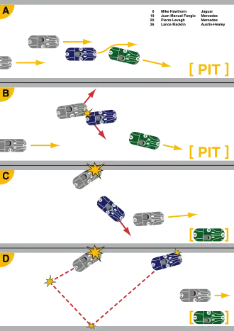 Hawthorns Jaguar, voorzien van schijfremmen, remde beduidend sneller af dan de concurrerende Mercedes van Levegh. De plotselinge remactie van Hawthorn zorgde ervoor dat de zojuist ingehaalde Austin-Healey moest uitwijken naar het midden van de baan, zodat deze de Jaguar in kon halen. Helaas zag Lance Macklin de snel naderende Pierre Levegh en Juan Manuel Fangio over het hoofd. Fangio reed op dat moment op een tweede positie en stond op het punt Levegh op een ronde te zetten. Levegh had op dat moment geen tijd om te reageren en raakte de linkerachterkant van de auto van Macklin. Het aerodynamische ontwerp van de Austin-Healey leek op een lange schansachtige carrosserie. Toen Levegh de Austin-Healey raakte, werd zijn auto gelanceerd naar de linkerkant van de baan, waar hij in een dam van aarde, bedoeld om de toeschouwers te beschermen, insloeg.