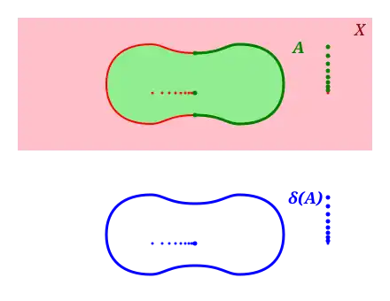 In de figuur hieronder is een deelverzameling A van het vlak in het groen weergegeven. Een rode kleur geeft uitdrukkelijk aan dat sommige punten van het vlak niet tot A behoren. Daaronder staat een schets van de rand van A in het blauw. De rand van A bevat limietpunten van rijen in A waarvan de limiet niet tot A behoort. De rand bevat eveneens limietpunten van rijen in het complement van A waarvan de limiet tot A behoort.