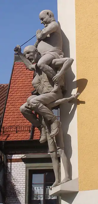 - ↑ Deze 50 m hoge toren speelde vanaf de 13e eeuw een belangrijke rol als uitkijkpost. Hij heeft, vanwege de witte kleur, de bijnaam meelzak (Mehlsack).