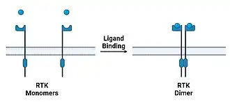 Als een groeifactor aan het extracellulaire domein van een RTK bindt, zal de RTK dimeriseren met een aangrenzend RTK. Dimerisatie leidt tot activering van de intracellulaire kinasedomeinen van het eiwit in het cytoplasma. Het eerste substraat van deze domeinen is de receptor zelf. Er treedt fosforylering op tussen de intracellulaire domeinen, waarbij het tyrosineresidu fungeert als ontvanger van de fosfaatgroepen. De gefosforyleerde receptor is nu geactiveerd en zal een interactie aangaan met andere eiwitten binnen de cel zodat het signaal wordt doorgegeven.