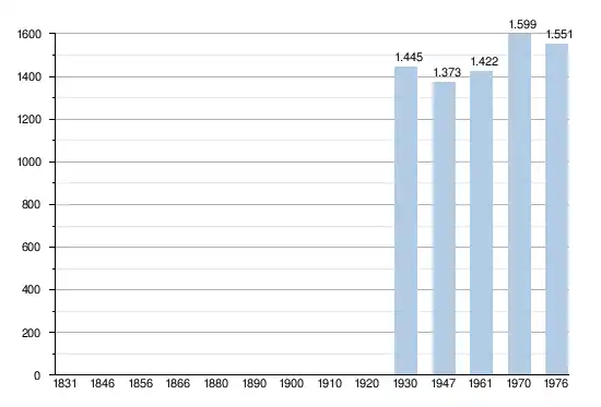 - Bronnen:NIS, Opm:1930 tot en met 1970=volkstellingen, 1976 inwoneraantal op 31 december
