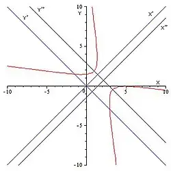 Bij een hyperbool kan ook een asymptoot als -as gekozen worden, en de oorsprong weer op het snijpunt van de asymptoten. De gereduceerde vorm is dan