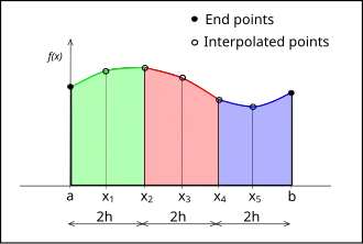 De regel van Simpson benadert de integraal van een functie over het interval als de integraal van de tweedegraadspolynoom die de functie benadert en in de eindpunten en het midden van het interval met de functie overeenkomt, d.w.z.