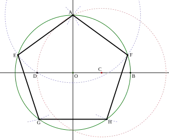 Een manier om een regelmatige vijfhoek te construeren met passer en liniaal werd al gegeven door Euclides. Het kan op verschillende manieren, bijvoorbeeld: