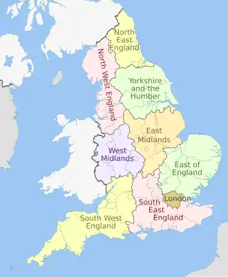 De negen regio's in Engeland zijn geen bestuurlijke laag met uitzondering van Greater London. Deze onderverdeling werd in 1994 ingevoerd onder de regering van John Major. De regio's waren tussen 1999 en het vertrek van het Verenigd Koninkrijk uit de Europese Unie in 2020 statistische NUTS level 1-regio's. In 1998 werd de regio Merseyside samengevoegd met regio North West England. De macht van een regio is beperkt en er zijn geen gekozen regionale bestuurders, met uitzondering van Groot Londen. De regio's bestaan elk uit een of meer county's en unitary authorities.