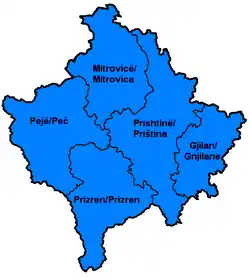 De door UNMIK ingestelde regio’s kwamen overeen met de districten die onder Servisch bestuur bestonden en die tot op heden in de Servische wet worden gehandhaafd.[4]