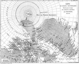 Aan de kust van het eiland fictieve eiland Nieuw Amerika (op de kaart in het boek is het een voortzetting van het huidige Ellesmere-eiland) ontdekt men de overblijfselen van een schip dat werd gebruikt door een expeditie uit de Verenigde Staten, de Porpoise. Dokter Clawbonny stelt voor een huis van ijs te maken. De reizigers overwinteren op het eiland en overleven voornamelijk dankzij de vindingrijkheid van Dokter Clawbonny (die in staat is om vuur te maken met een ijslens, kogels te maken van bevroren kwik en aanvallen van ijsberen af te weren met op afstand bestuurde explosies van zwartkruit).