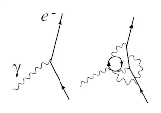 Als men elektromagnetische interacties van geladen deeltjes berekent, is het verleidelijk de terugslag van het veld van het deeltje zelf te negeren. Deze terugslag is nodig om de wrijving te verklaren die een geladen deeltje ondervindt bij het uitstralen van straling. Indien een elektron een punt wordt verondersteld te zijn, zal de waarde van de terugslag divergeren om dezelfde reden als waarom de massa divergeert: het veld dicht bij het elektron wordt onbeperkt groot.