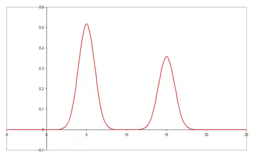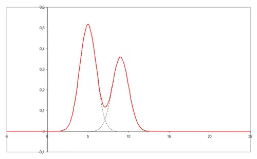 De pieken liggen hier helemaal vrij van elkaar. Het is nu mogelijk om van beide pieken de oppervlakte te bepalen om de verhouding van de twee componenten in het monster te bepalen.