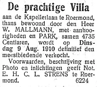 - Anoniem (18 januari 1898) ‘Limburgsch Nieuws. Naar wij vernemen is de villa-Claus [...] eigendom geworden van den heer W. Mallmann [...]’, Limburger Koerier, tweede blad, [p. 2].