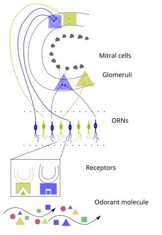 Menselijk reukorgaan 1. Reukkolf 2. Mijtercellen 3. Bot 4. Neusslijmvlies 5. Glomerulus (reuk) 6. Reukreceptor