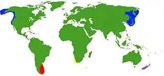 | leefgebied Enteroctopus soorten: E. dofleini in blauw, E. megalocyathus in roodd, E. magnificus in geel, and E. zealandicus in paars. | |||||||||||||||
