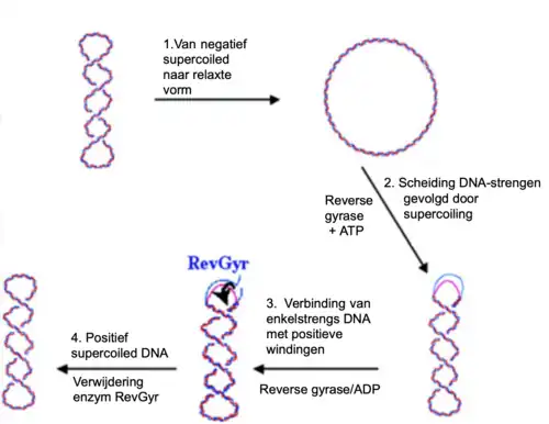De reverse gyrase is een topo-isomerase type I die energie van ATP gebruikt. De gyrase wordt reverse genoemd omdat in plaats van de spanning te verminderen, zoals gebeurt bij normale topo-isomerasen, het enzym de spanning verhoogt door positieve supercoils te introduceren. Bij hoge temperaturen denatureert het DNA, de strengen scheiden zich van elkaar. De supercoils verhinderen de denaturatie van het DNA.