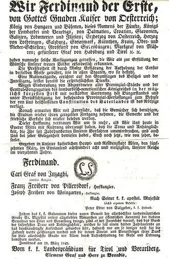 Na het afwijzen van petities voor liberale hervormingen braken op 12 maart in Wenen rellen uit. Klemens von Metternich ontvluchtte de stad en op 15 maart hief Ferdinand de censuur op en beloofde een nationale vergadering bijeen te roepen. In april werd een nieuwe constitutie uitgevaardigd, die na hernieuwde rellen in mei werd herzien. Na de Weense Oktoberopstand, die door Alfred I zu Windisch-Graetz bloedig werd neergeslagen, deed keizer Ferdinand troonsafstand ten gunste van zijn 18-jarige neef Frans Jozef I, die onder de hoede van Felix zu Schwarzenberg, met Russische hulp, de orde herstelde.