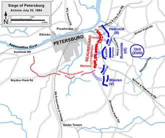 - IX Corps onder leiding van generaal-majoor Ambrose Burnside bestaande uit de divisies van de brigadegeneraals James H. Ledlie, Robert B. Potter, Orlando B. Willcox en Edward Ferrero (deze divisies bestonden vrijwel uitsluitend uit Afro-Amerikaanse soldaten). Generaal-majoor John G. Parke verving Burnside na de Slag van de Krater.