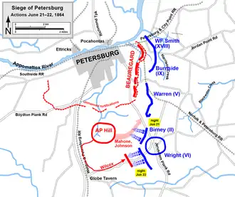 - Second Corps onder leiding van luitenant-generaal Jubal A. Early werd op 12 juni gedetacheerd voor een operatie in de Shenandoahvallei en speelde geen rol in de verdediging van Petersburg.