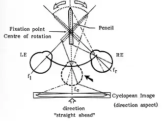 Hering beschreef in 1861 dat we de wereld lijken waar te nemen vanuit een punt, halverwege tussen beide ogen, in plaats van vanuit elk oog afzonderlijk.[3] Hij noemde dit punt een cyclopisch oog, naar de cyplopes uit de Griekse mythologie.[4] Hering beschreef ook een methode om te laten zien hoe de twee netvliesbeelden in dit cyclopische oog schijnbaar worden samengevoegd tot een gecombineerd beeld. Hij noemde deze methode cyclopische projectie. Hij illustreerde deze methode met een potlood dat zo wordt gehouden dat het van de waarnemer af wijst, zie de afbeelding. De methode bestaat in feite uit het roteren van de beelden van de twee ogen rond het fixatiepunt naar elkaar toe totdat ze samenvallen in het cyclopische oog. Geometrisch gezien verandert dit de richting niet, maar het geeft wel een beknopte beschrijving van hoe we richtingen lijken te zien. Dit wordt ook wel de wet van Hering voor de gemeenschappelijke binoculaire richting genoemd. [5]