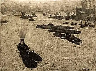 - ↑ Bedoelde ets bevindt zich in het Rijksprentenkabinet onder de titel Sleepboot voor Waterloo Bridge.