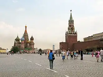 Het Rode Plein (vanuit het noorden) met de Pokrovkathedraal en de Spasskitoren van het Kremlin
