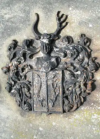 | Schild | Gedeeld; een rode gewei op zilver en een zilveren oeroshoorn op rood | |||