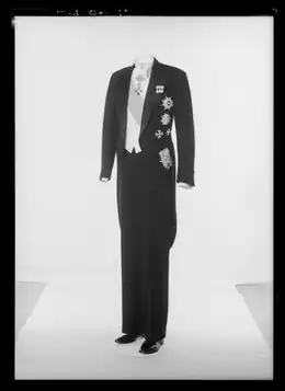 - Een broche met miniaturen wordt op de linkerrevers gedragen.