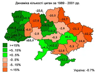 In de Sovjetvolkstelling van 1897 werden er 10.031 Roma in Oekraïne geteld. Ondanks de Porajmos nam het aantal Roma in Oekraïne tussen 1939 en 1959 toe, vooral vanwege de annexatie van West-Oekraïne. Tot het uiteenvallen van de Sovjet-Unie nam het aantal Roma jaarlijks toe. Tussen de Sovjetvolkstelling van 1989 (47 917) en de Oekraïense volkstelling van 2001 (47 587) is het aantal geregistreerde Roma met 330 personen afgenomen (-0,7%). In grote delen van het oosten van Oekraïne nam het aantal Roma in deze periode drastisch af: -32,2% in Oblast Loehansk, -21,1% in Oblast Charkov en -16,7% in Oblast Soemy. Daarentegen nam het aantal Roma in het westen van Oekraïne toe: +86,5% in Oblast Ivano-Frankivsk, +64,4% in Oblast Tsjernivtsi en +46,8% in Oblast Lviv.