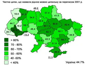 De Roma in Oekraïne spreken verschillende talen. Volgens de volkstelling van 2001 was het Romani, met 21 266 moedertaalsprekers, de grootste taal onder de Oekraïense Roma (44,7%). Het percentage van Romani-sprekers varieerde van 11% in Sebastopol tot 81% in de oblast Ivano-Frankivsk. Andere belangrijke talen onder de Roma waren het Oekraïens (21%), het Hongaars (19%) en het Russisch (13%). Het Hongaars werd vooral gesproken door de Roma die in de oblast Transkarpatië woonden (65,7% van de Roma sprak daar Hongaars als moedertaal). In de oblast Odessa sprak een minderheid van 8,7% van de Roma het Moldavisch, terwijl een nog kleinere minderheid van de Roma op de Krim het Krim-Tataars sprak (1,8%).