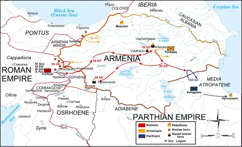 Sinds het laatste conflict onder leiding van Lucius Vitellius in 37 na Chr. was Armenië een vazalstaat van Rome. Na de moord op keizer Claudius I in 54, profiteerde de Parthische koning Vologases I ervan om Armenië in te lijven en zijn jongste halfbroer Tiridates aan te stellen, als nieuwe koning van Armenië.
