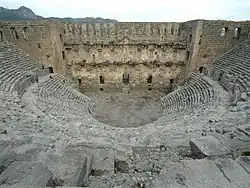 - De orchestra, de halve cirkel voor het podium aan de voet van de tribunes. In de Romeinse tijd de plaats waar de notabelen zaten. De ruimte werd ook wel gebruikt voor de voorstellingen.