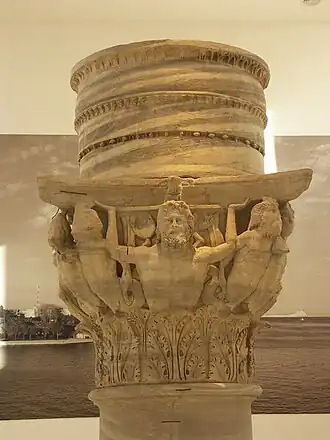 Het oorspronkelijk kapiteel van de intacte zuil bevindt zich in het museum Corte d’Assise in Brindisi; in de haven staat een kopie gegoten uit hars. Het beeldt aan elk van de vier zijden een Romeinse god uit; het gaat gepaard telkens om een mannelijke en vrouwelijke god. Op de hoekpunten staan tritonen.