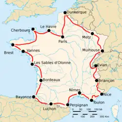 ![]() Route van de Ronde van Frankrijk 1925 met start en finish in Parijs. | |||