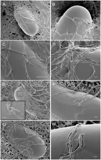 Sommige rondwormsoorten, zoals Mermis nigrescens hebben eieren met aan de polen vertakte filamenten (byssus, meervoud byssi).[56] Deze filamenten zijn vertakkingen van het eiwitmembraan van het ei en zorgen ervoor dat het ei zich kan vasthechten aan de ondergrond.