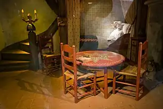 Binnen het huis van grootmoeder zien we een houten bedstede waar de wolf in witte slaapkleding ligt. Op de achtergrond is de muur bedekt met tegeltjes met daarop zwanen afgebeeld. In de kamer staan verder houten roodgekleurde meubels zoals stoelen, een tafel en nachtkast. Naast de nachtkast ligt hout. Op de tafel liggen een boek en een bril. In een houten pilaar links naast de bedstede is een gezicht, met rode snor en wenkbrauwen en groene ogen, te zien. Aan het begin van de trapleuning staat een vrouwenfiguur met twee kaarsen in haar handen. Ze draagt een wit bolhoedje. Links naast de voordeur staat een hoge klok. Op de klok staat de tekst: Alle die mijn vergeten, en sullen die tijt niet weten.[1]